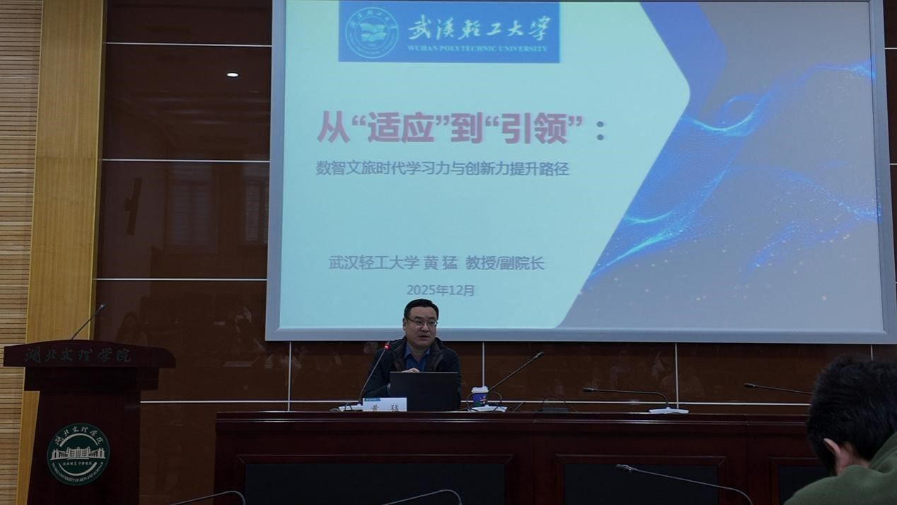 (通信员 黄婷)2025年12月5日上午,湖北文理学院MTA教育中心“文旅问道讲堂”在校图书馆一楼报告厅成功举办,旨在探讨数字经济与文旅深度融合背景下,湖北如何加快建设世界知名旅游目的地建设。讲堂以“数智赋能·区域洞察·创新引领”为主题,聚焦文旅前沿与地方发展,吸引我校MTA研究生、旅游管理专业及汉江研究院师生积极参与,现场学术氛围浓厚,展现了我校在服务区域战略、推动学科建设方面的积极探索。